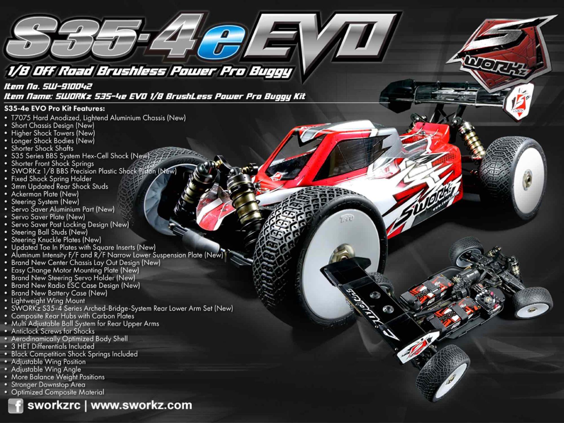 The S35-4e EVO is the design evolution from S35-4E Euros Champion. Further continuing with the successful SWORKz S35-4E 1/8 Electric Buggy platform, the new S35-4e EVO is designed for more higher level racing product. The new geometry from European Champion Edition conversion kit provides optimized corner speed compared with more easy handling and maximum traction. The S35-4e EVO features a T7075 hard anodized and lightened aluminum chassis with a new short wheel base design, that was tested for a long time by our factory pilots to guarantee the best speed balance for both front and rear suspensions. The standard HET differentials are included and provide High Density Motor Pinion Gear system for options. The new S35-4e EVO comes a brand new steering Lay-Down Type Steering Bellcrank servo savor system. With this new Ackerman design gives the driver the feeling of total control over the S35-4e EVO. The SWORKz S35-4e EVO standard includes the Arched-Bridge-System and the higher capacity shock system. This is a big step for S35-4e EVO, the design made the car go faster and be more stable. In the kit we include a special BBS piston and oil seal parts that the worlds team drivers tested during the race. They are made by a high Precision Plastic mold machine. Also included are specially made durable material parts for the suspension like inserts which our team drivers used and felt immediately more confident. The center chassis lay out is the brand new design for S35-4e EVO. Its provides 2 ways battery set up. Standard 2S peck batteries (or 2S shorty) can be used in saddle position for lower center of gravity. And one unit 4S standard peck(or shorty) also can be fit in side position. There many more small changes and smart ideas in your new SWORKz S35-4e EVO, it’s the evolution result which works by whole team that make the car being a real winner. The secret of a modern racing car is the possibility to adapt the setup to every track for top pilots but also have a standard setup that works on most tracks for hobby pilots. And your SWORKz S35-4e EVO is having these two characteristics in perfection. S35-4e EVO Kit Features