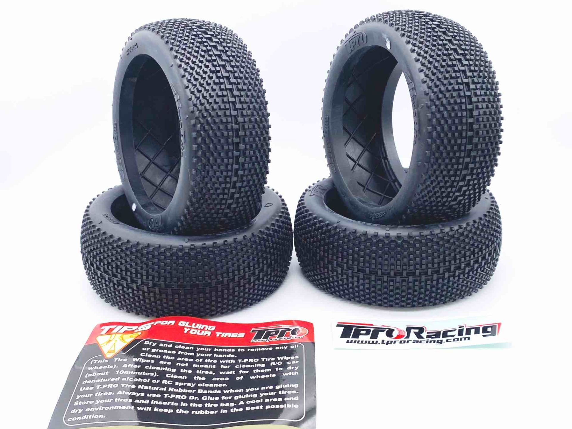Unsere TPRO Reifen sind in 2 unterschiedlichen Montagearten erhältlich. Einmal die unverklebten Reifen in einem Satz von 4 Stück, oder zweites als fertig verklebte Reifen in einem Paar von 2 Stück. Die verklebten Räder verwenden unsere blaue medium TPRO Einlage (TP1309I3) und die gelbe Felgen.